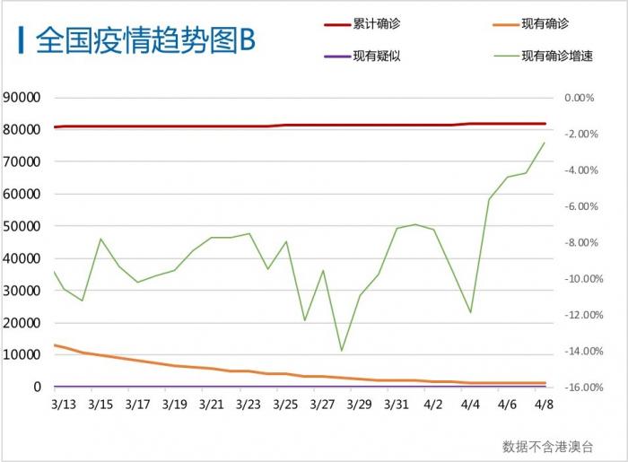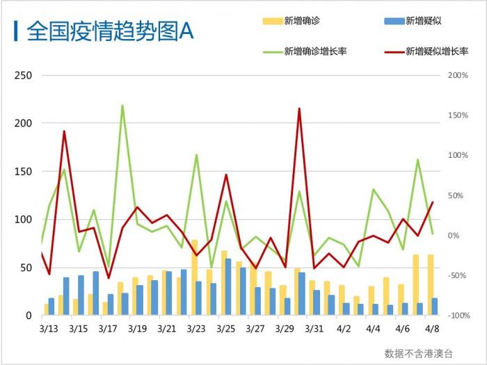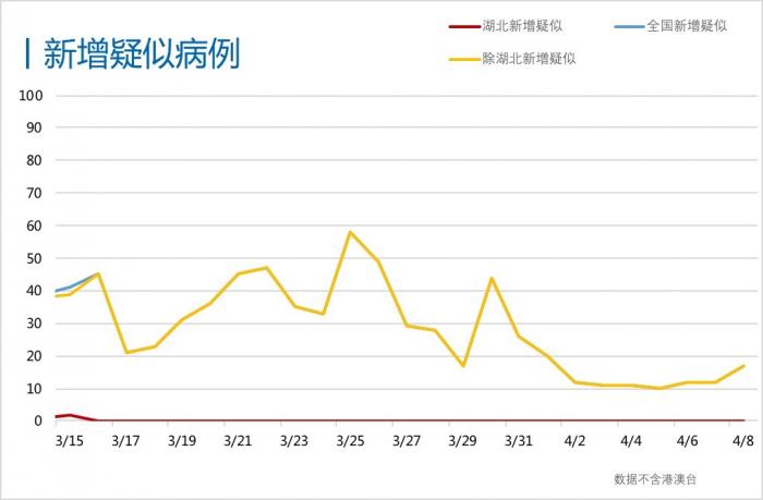 截至4月8日24时,全国现有疑似病例73例,新增疑似病例17例,其中16例为境外输入疑似病例,1例为黑龙江本土疑似病例。其中湖北现有疑似病例保持为零,已连续24天零新增。