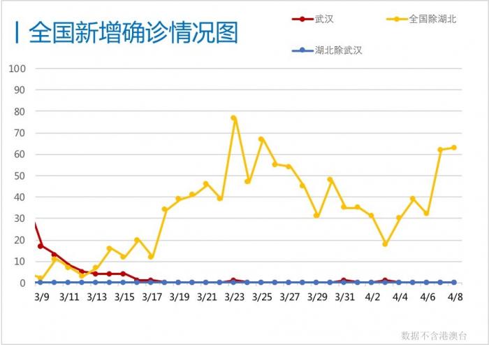 据国家卫健委关于新型冠状病毒肺炎通报的最新数据,4月8日,31个省(自治区、直辖市)和新疆生产建设兵团新增确诊病63例(累计81865例),现有确诊病例1160例,新增疑似病例17例(现有73例),重症病例减少13例(现有176例),新增治愈出院病例91例(累计77370例),新增死亡病例2例(湖北2例,累计3335例)。