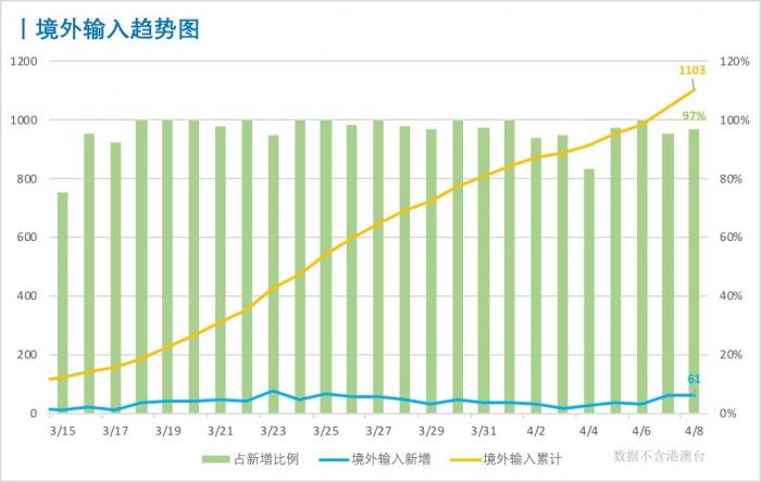 截至4月8日24时,新增报告境外输入确诊病例61例,累计报告境外输入确诊病例1103例。新增无症状感染者56例,其中境外输入无症状感染者28例。