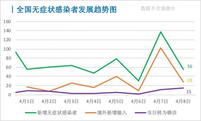 4月8日,全国新增新增无症状感染者56例,其中境外输入无症状感染者28例;当日转为确诊病例15例(境外输入15例);当日解除医学观察32例(境外输入7例);尚在医学观察无症状感染者1104例(境外输入364例)。