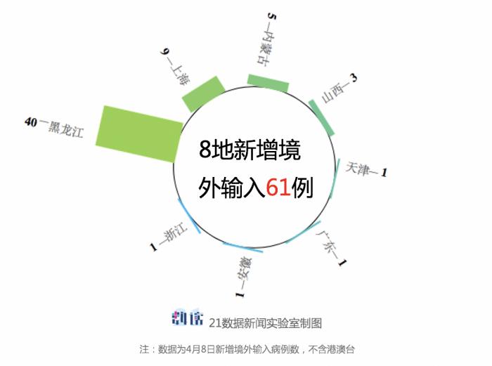 另一方面,4月8日,全国新增61例境外输入病例,较前一日增加2例。境外输入病例连续4天占新增病例的95%以上。其中,黑龙江新增境外输入确诊病例40例,均为中国籍,从俄罗斯输入。据悉,中俄陆路边境口岸人员通道目前已全部临时关闭。