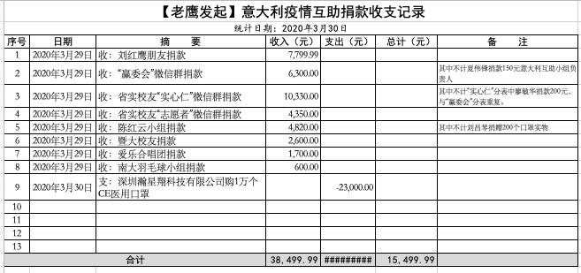 傍晚,口罩募集完成。短短48小时内的时间,我们共收到捐款38499.99元,厂家再增加配捐,这样我们可以筹集到20000个口罩! 比计划足足翻了一倍! (捐款名单附后)。我们也就对朋友们宣告结束了此次募集,并整理和公布了捐助名单。