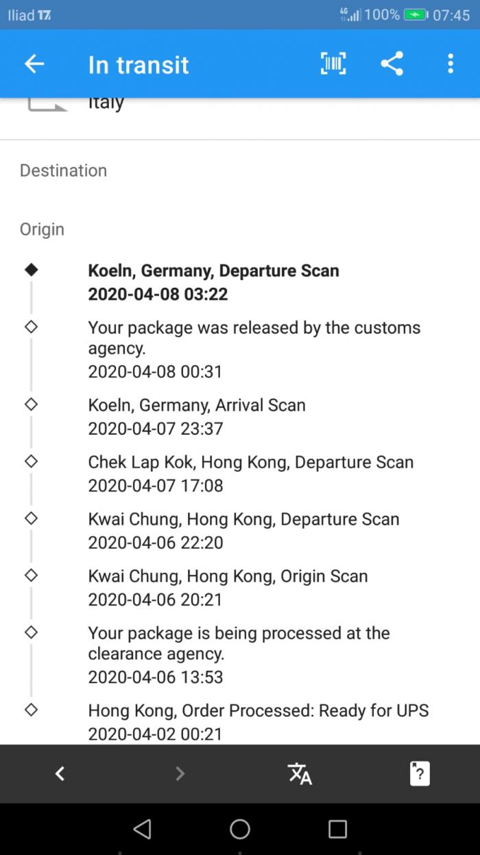 疫情期间的航运变得完全不可理解。这些天漫长的等待期变成了家人的追踪游戏,每天姐夫都会在群里发最新的包裹动态。他使用网站www.17track.net可追踪几乎各家公司的快递。