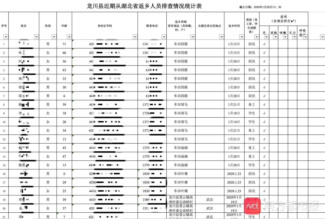 28号左右,我在我们同乡会的微信群里看到了“龙川县近期从湖北省返乡人员排查情况统计表”这份表格,上面有我的身份证号码、电话、返乡详细住址、返乡时间、症状(是否发热、咳嗽、发力、呼吸困难)等信息。