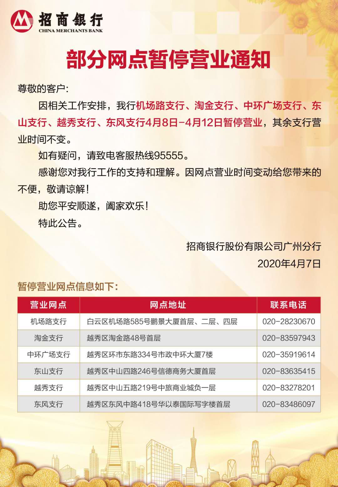 招商银行广州分行4月8日在官网上公告称:因相关工作安排,我行机场路支行、淘金支行、中环广场支行、东山支行、越秀支行和东风支行于4月8日至12日暂停营业,其余支行营业时间不变。