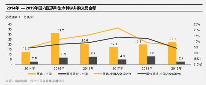 2019年中国医药和生命科学的并购金额为250亿美元,数量为588起,占全球并购总额的6%(2018年占10%)。