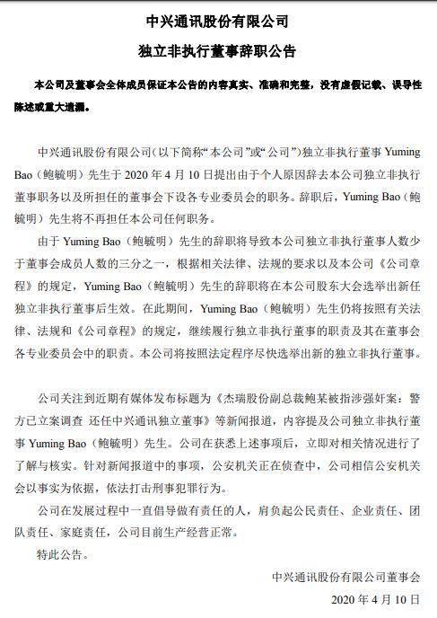 4月10日早间6:43,中兴通讯(000063.SZ)官方微博消息称,中兴通讯在获悉相关媒体报道后,高度重视,公司董事会已收到鲍毓明辞去独立非执行董事职务的申请。