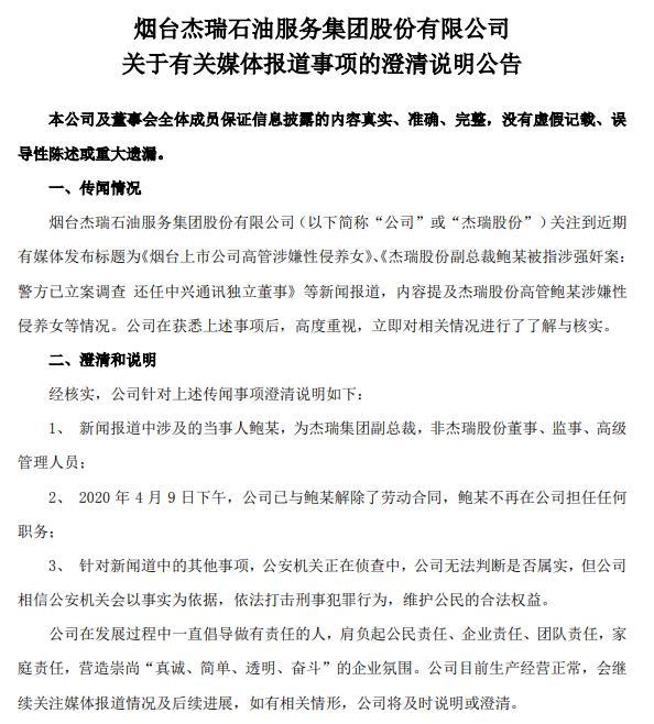 与此同时,杰瑞股份(002353.SZ)今日早间公告称,关注到近期有媒体发布《烟台上市公司高管涉嫌性侵养女》等报道,报道中涉及的当事人鲍某,为杰瑞集团副总裁,非杰瑞股份董事、监事、高级管理人员;4月9日下午,公司已与鲍某解除了劳动合同,鲍某不再在公司担任任何职务;针对新闻道中的其他事项,公安机关正在侦查中,公司无法判断是否属实,但公司相信公安机关会以事实为依据,依法打击刑事犯罪行为,维护公民的合法权益。