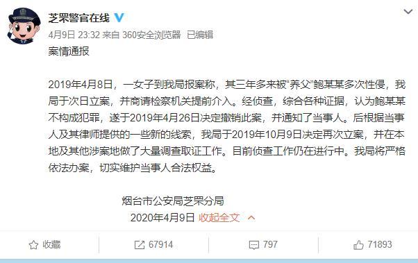 4月9日晚间,据@芝罘警官在线 通报:2019年4月8日,一女子到我局报案称,其三年多来被“养父”鲍某某多次性侵,我局于次日立案,并商请检察机关提前介入。经侦查,综合各种证据,认为鲍某某不构成犯罪,遂于2019年4月26日决定撤销此案,并通知了当事人。后根据当事人及其律师提供的一些新的线索,我局于2019年10月9日决定再次立案,并在本地及其他涉案地做了大量调查取证工作。目前侦查工作仍在进行中。我局将严格依法办案,切实维护当事人合法权益。
