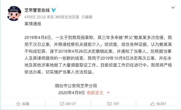 4月9日夜间,山东省烟台市公安局芝罘分局通过微博发布案情通报,称,鲍某某涉嫌性侵“养女”案,“我局于2019年10月9日决定再次立案,并在本地及其他涉案地做了大量调查取证工作。目前侦查工作仍在进行中。”