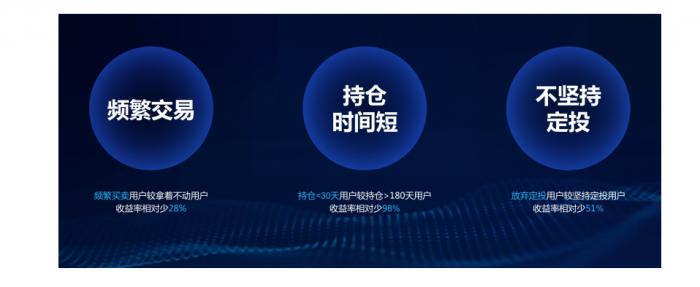 支付宝的追踪分析数据显示,频繁交易的用户比不频繁的用户,理财收益会减少近三成。放弃定投用户比坚持定投用户,理财收益会减少近一半。而持仓小于1月的用户,比持仓超过半年的用户,收益减少了98%。也就是说,两个人同样的本金,持仓越长可能赚到1000元,持仓越短,可能只赚到20块钱。