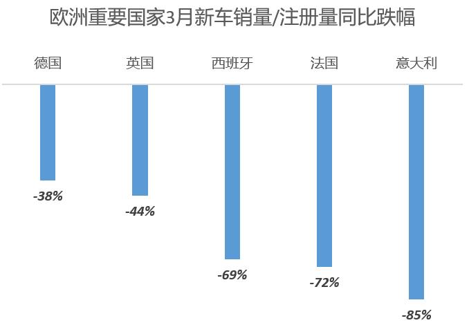 在疫情最严重的意大利和西班牙,3月汽车销量更是分别同比下跌了85%和69%。即便是提出群体免疫而迟迟拒绝颁布禁足令的英国也无法幸免,英国汽车生产商与贸易商协会确认该国3月新车注册量同比下降44%。