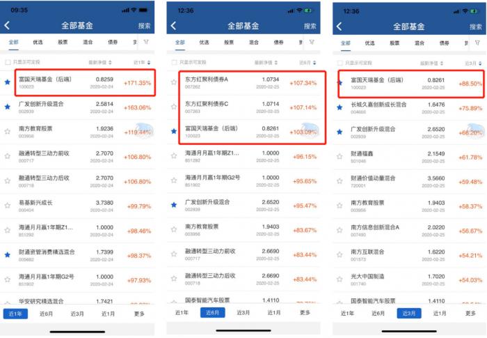 上海银行披露的数据显示,截至2020年2月24日,上海银行App显示富国天瑞近一年涨幅为171.35%,位列所有基金榜首。