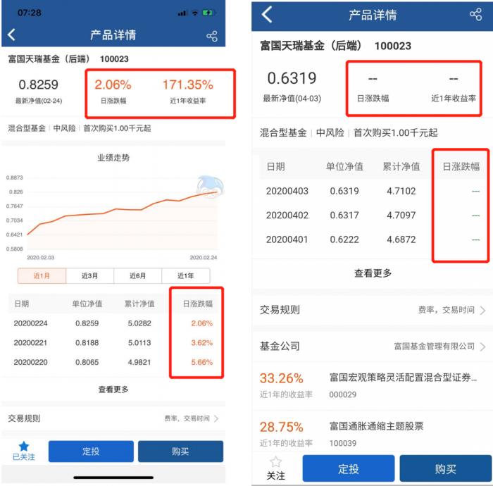 目前,刷新上海银行有关富国天瑞基金的页面,该基金相关收益率数据已经撤下,上海银行App显示的基金净值也只能显示到2020年3月16日,此前,该只基金的净值数据最早显示到2019年2月26日。