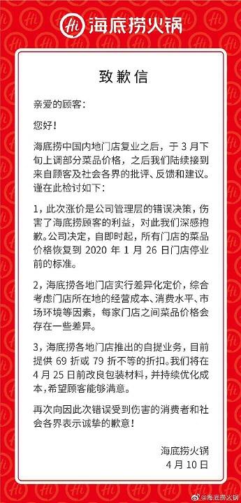 针对近期涨价引发广大吃货们怒怼,海底捞(06862.HK)4月10日在其官方微博公开道歉,表示门店此次涨价是公司管理层的错误决策,伤害了海底捞顾客的利益。并宣布从即日将中国内地门店菜品价格恢复到今年1月26日门店停业前标准。