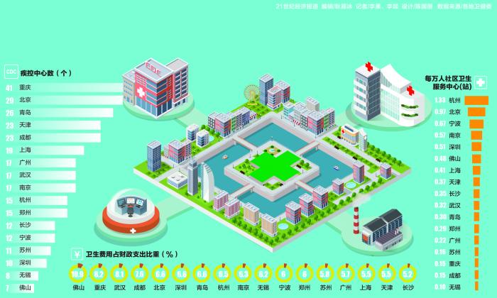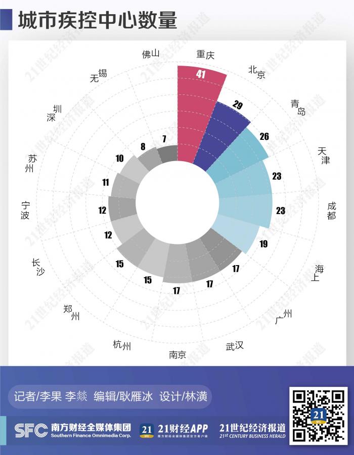 其中,重庆、北京和青岛所拥有的疾控中心最多,分别是41、29和26家;其后是天津和成都,各有23家,其余12座城市疾控中心数均不足20家。