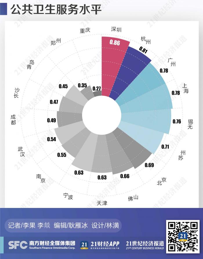 根据21世纪经济研究院的测算,17个万亿元GDP城市中,公共卫生服务指数得分最高的城市是深圳,其次是杭州、上海、广州、无锡,位列前五。这些城市普遍是城镇化率较高的地区,像深圳2018年城镇化率已达99.75%,全国第一;当年婴儿死亡率和新生儿死亡率只有1.37‰、0.84‰。