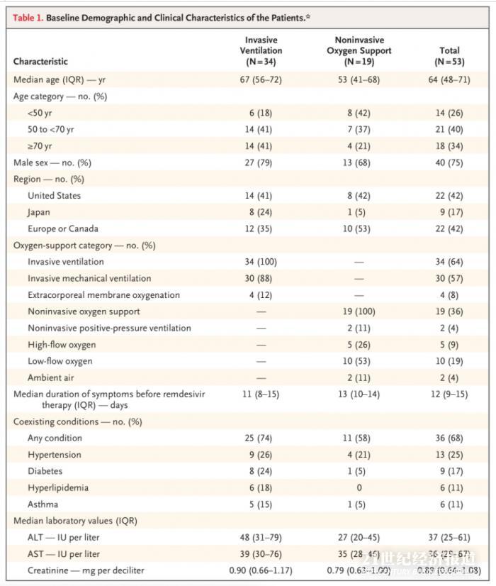 上述表格显示了53例患者的基线人口统计学和临床特征。美国(22位患者),日本(9位),意大利(12位),奥地利(1位),法国(4位),德国(2位),荷兰(1位),西班牙(1位)和加拿大( 1)。共有40例患者(75%)为男性,年龄范围为23至82岁,中位年龄为64岁(四分位数范围为48至71)。大多数患者(34 [64%])接受有创通气,其中30例(57%)接受机械通气,4例(8%)接受ECMO。