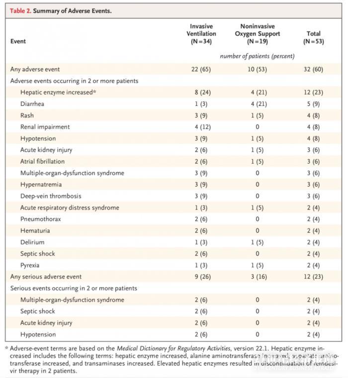 共有32例患者(60%)在随访期间报告了不良事件。最常见的不良事件是肝酶升高,腹泻,皮疹,肾功能不全和低血压。通常不良反应在接受有创通气的患者中更为常见。共有12名患者(23%)出现严重不良事件。在基线接受有创通气的患者中报告了最常见的严重不良事件,即多器官功能障碍综合征,败血性休克,急性肾损伤和低血压。