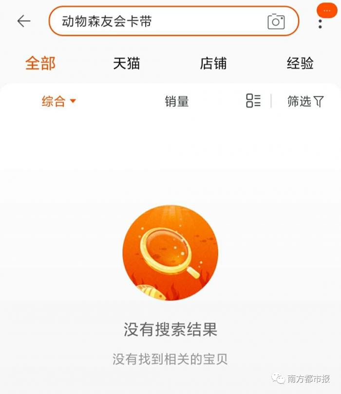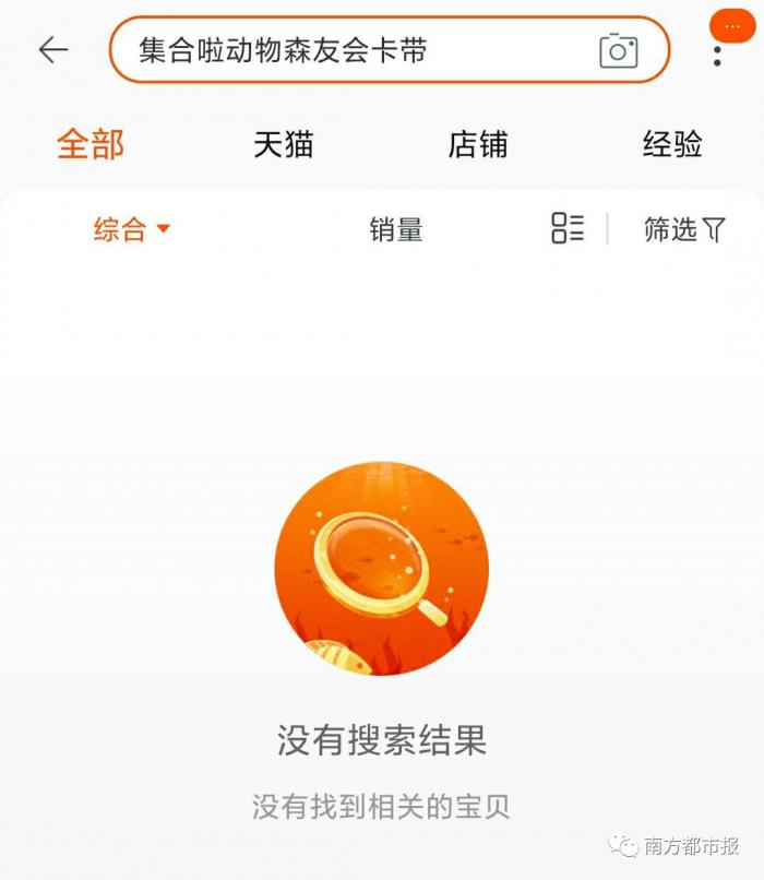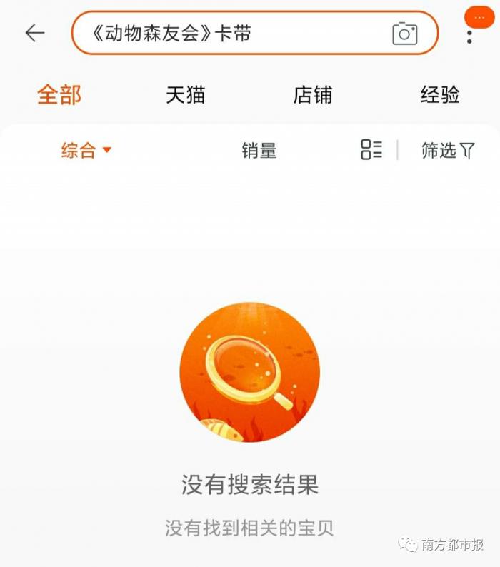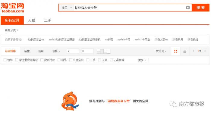 今天(11日)下午14时许,南都君通过网页版淘宝搜索“动物森友会卡带”,页面显示“没有找到与‘动物森友会卡带’相关的宝贝”。