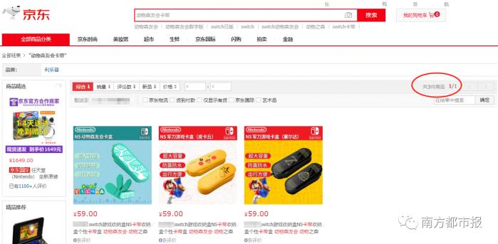 通过网页版京东搜索“动物森友会卡带”,页面仅显示有3件商品,为三款switch游戏收纳盒。