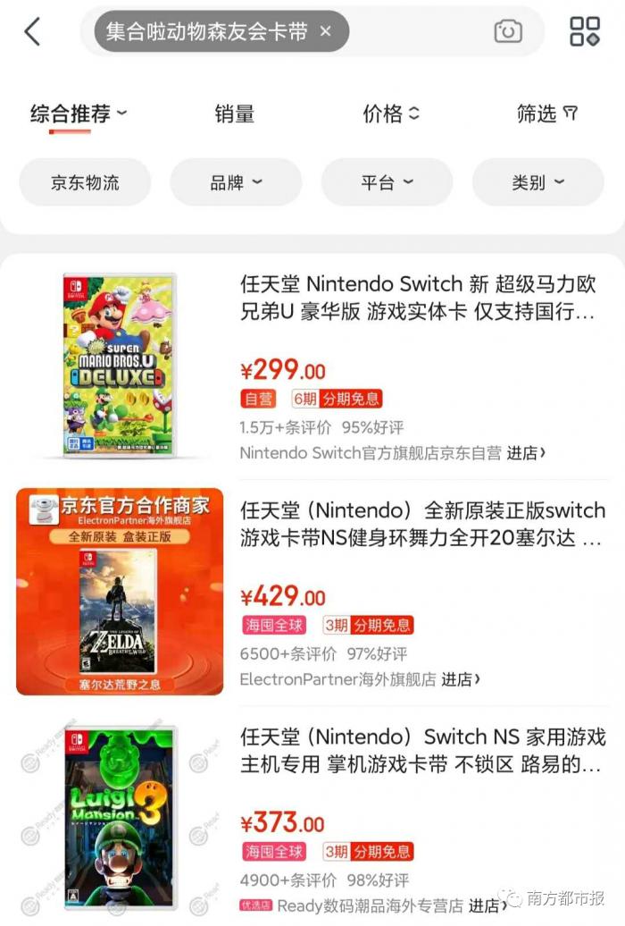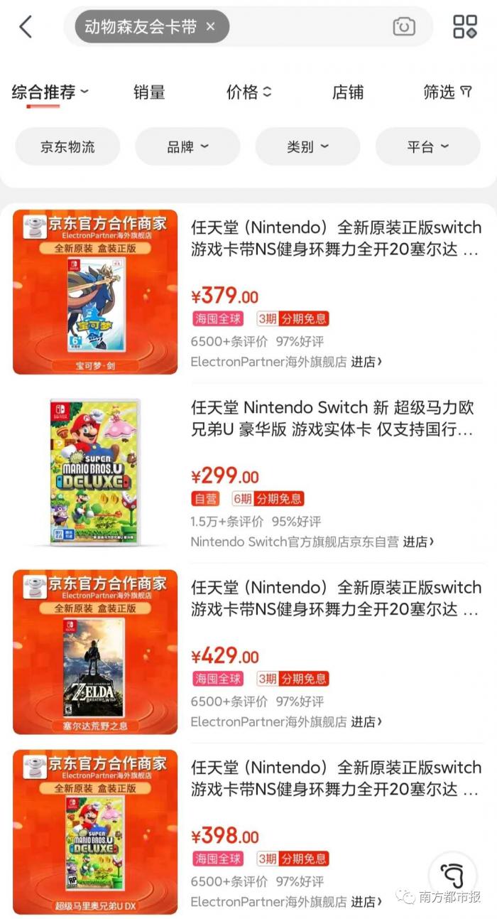 通过手机版京东搜索“动物森友会卡带”“集合啦动物森友会卡带”,页面则显示任天堂其他游戏卡带的相关商品详情。