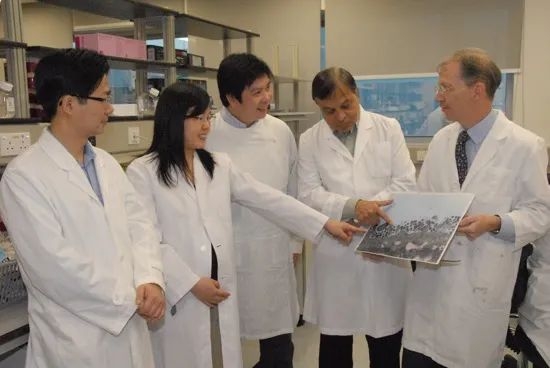2013年,香港大学李嘉诚医学院研究团队首度发现新型冠状病毒引致肺病及扩散至其他器官的原理,并发现干扰素能抑制病毒在肺部复制,对未来治疗带来重要启示。图为研究团队: (左起)潘烈文博士、陈韵怡博士、陈志伟博士、裴伟士教授及黎国思教授 图 / 香港大学李嘉诚医学院
