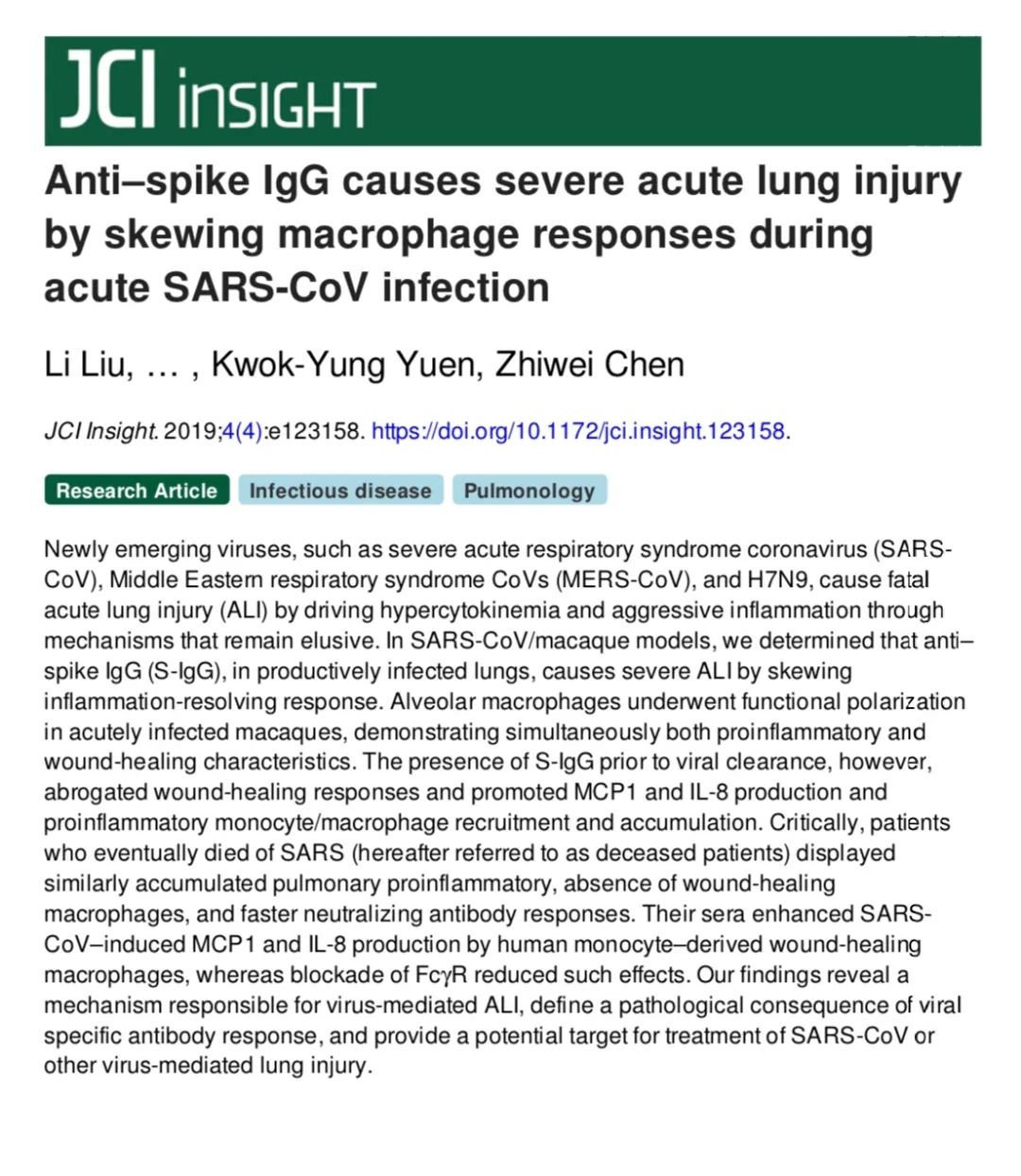 SARS的ADE的实质是:当抗体结合了病毒再进入到巨噬细胞里,使得本来应该起修复作用的免疫修复性巨噬细胞变成了促进炎症的巨噬细胞,导致炎症加重,肺损伤也就进一步加剧了