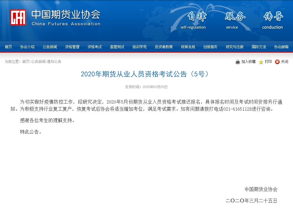 3月25日,中国期货业协会发布公告,决定推迟2020年5月份期货从业人员资格考试报名,恢复考试后协会将适当增加考位,满足考试需求。