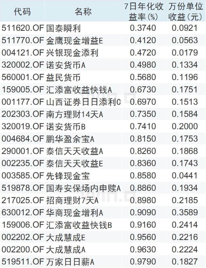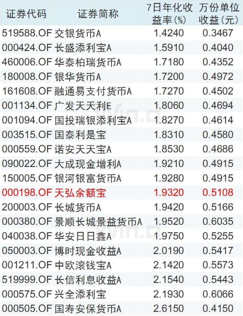 先看余额宝同一平台的产品,数据显示,截至4月9日,比余额宝收益更低的货币基金,还有11只。