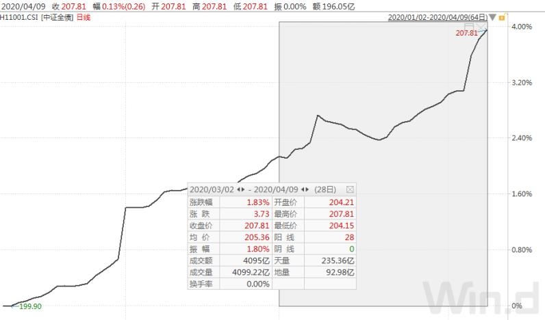 先看中证全债指数,该指数是综合反映银行间债券市场和沪深交易所债券市场的跨市场债券指数,指数的样本由上述两个市场的国债、金融债券及企业债券组成。Wind数据显示,中证全债指数2月末以来涨幅1.83%。