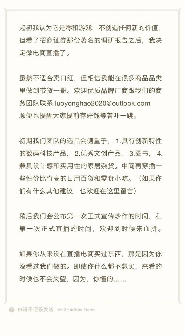 3月19日,罗永浩微博宣布直播带货后,超过1000个厂商与其联系,其中不乏知名厂商。