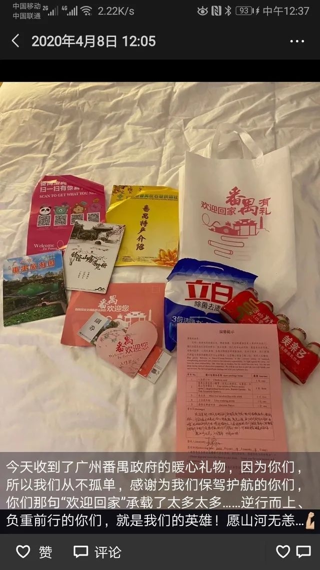 在隔离酒店,南都记者采访到其中一位从澳大利亚回国的留学生王晨(化名),家在哈尔滨的她,此次回国先取道广州,按照相关政策规定,需在广州完成14天的集中隔离。在她的微信朋友圈里,记录了从回国前到隔离期间的生活,她在朋友圈晒出了来到酒店后,番禺区送上的大礼包:旅游地图、番禺特产、旅游景点赠票等,作为一名前往哈尔滨经广州入境的留学生,她表示,在这里感受到家一般的温暖。