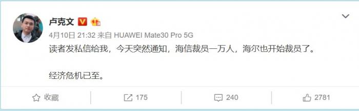 此前,一新浪微博博主发文称,“读者发私信给我,今天突然通知,海信裁员一万人,海尔也开始裁员了。经济危机已至。”消息一出旋即引起关注。