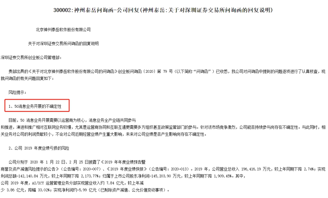 在回应中,神州泰岳称,全资子公司新媒传信自成立来,作为中国移动的合作伙伴曾支持其运营“飞信”,“飞信”与“5G消息”在应用场景及展现形式上存在着一定程度上的差异,公司能否在“5G消息”上发力存在着不确定性。