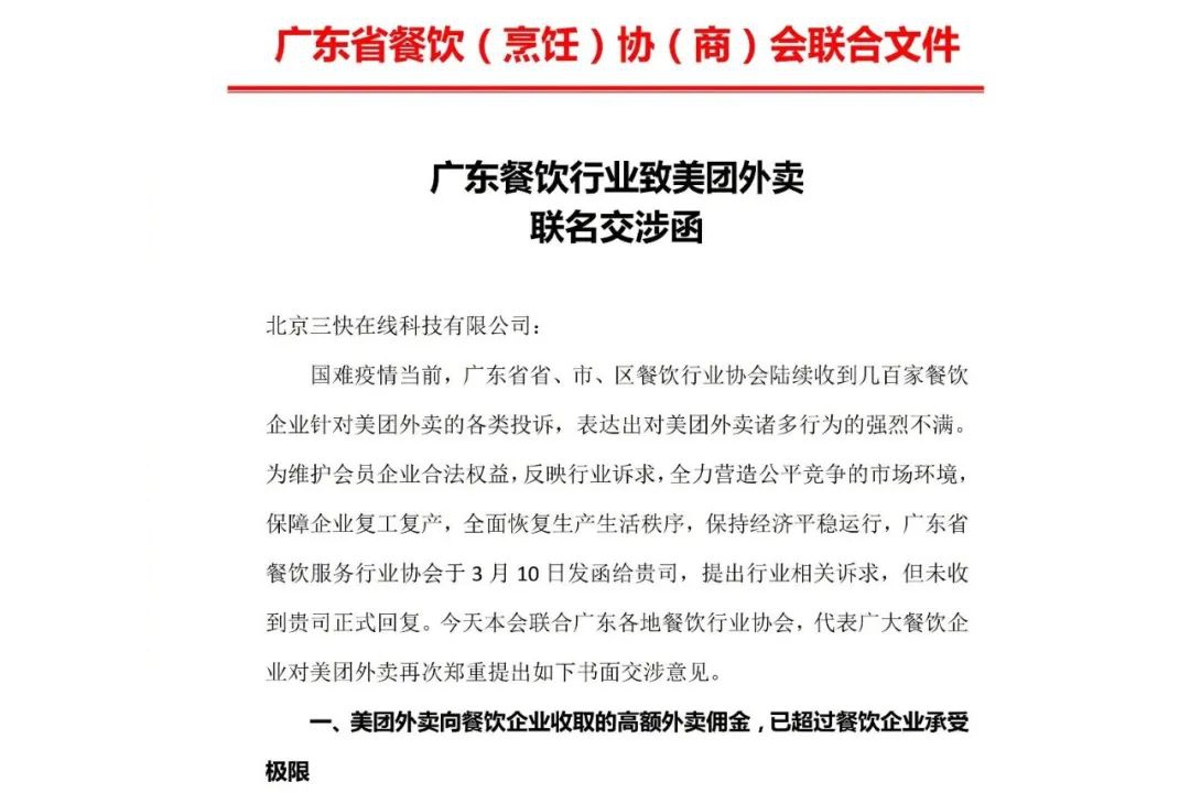争端的肇始是,4月10日,广东省餐饮服务行业协会发布“致美团外卖联名交涉函”,其中交涉重点在两方面: