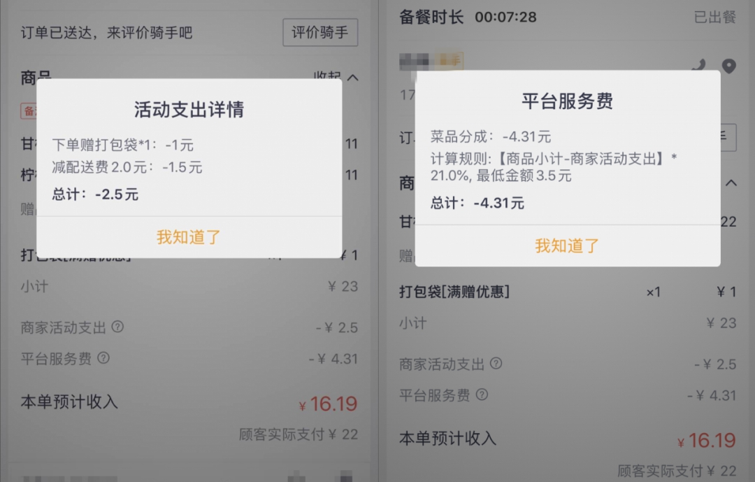 刘兴向《21CBR》记者提供的后台订单截图显示,顾客购买一份售价20元的产品,加上2元的配送费,实际支付总额是22元,商家要另外支出1.5元配送费和1元包装费,再扣除4.31元的平台服务费后,商家实际到账收入为16.19元,实际费率是26.43%。
