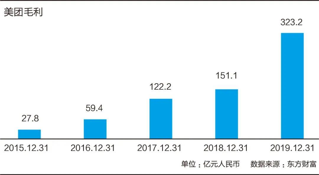 外卖业务对美团的重要性不言而喻。2019年,其收入为975亿元,餐饮外卖总营收为548亿元,占比高达56.2%;外卖贡献了102.33亿的毛利,占到美团总毛利的31.6%。