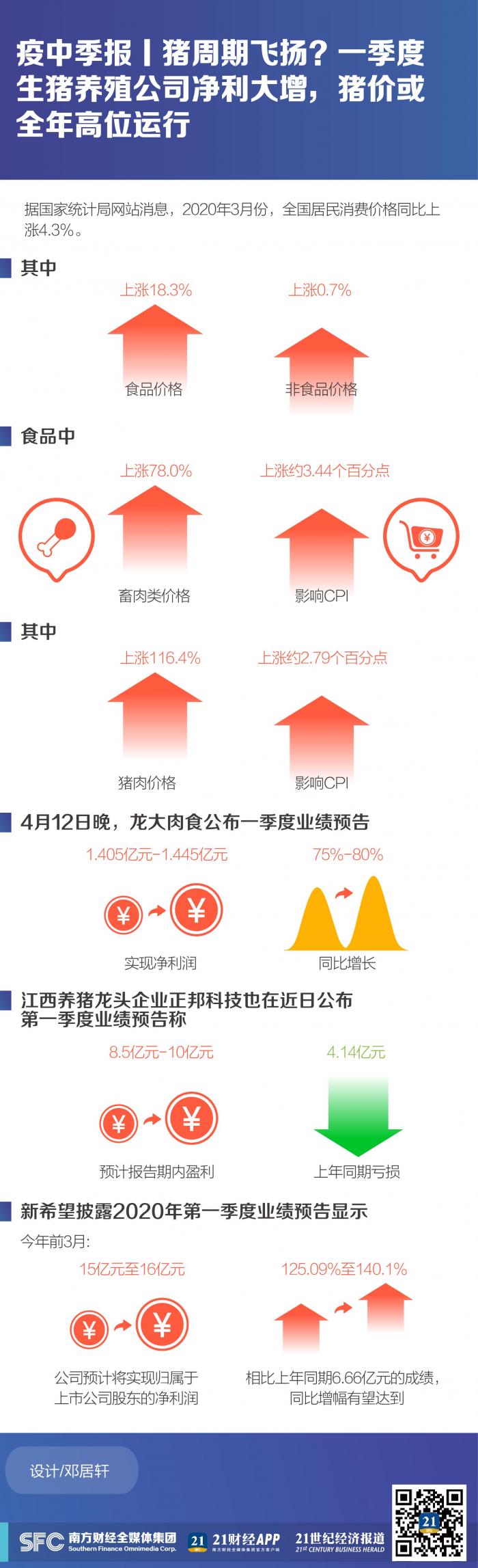 江西养猪龙头企业正邦科技也在近日公布第一季度业绩预告称,预计报告期内盈利8.5亿元-10亿元,上年同期亏损4.14亿元。
