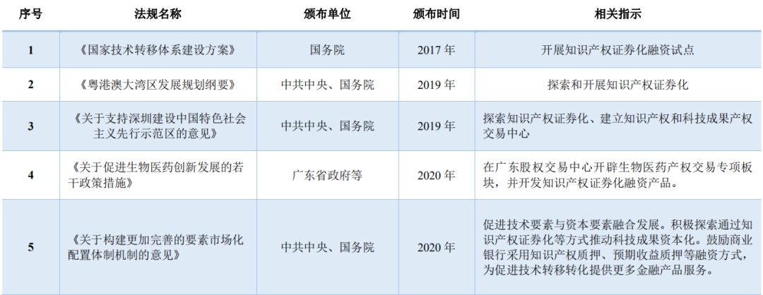 2020年4月9日,中共中央、国务院颁发《关于构建更加完善的要素市场化配置体制机制的意见》指出:促进技术要素与资本要素融合发展。积极探索通过知识产权证券化等方式推动科技成果资本化。鼓励商业银行采用知识产权质押、预期收益质押等融资方式,为促进技术转移转化提供更多金融产品服务。