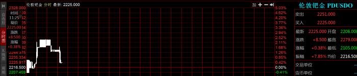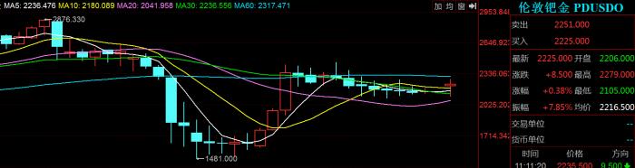 钯金市场上妖风阵阵,今日钯金现货低开高走,目前涨幅0.38%,报价2225美元/盎司,不过振幅则达到7.85%,达到174美元/盎司,期货市场活跃,盘中涨幅一度超过5%,目前则回落至3.31%。今年钯金价格振幅剧烈,年初继续走在小牛行情的路上,涨幅一度超过40%,2月27日达到最高价2876.33美元/盎司。不过随后由于新冠疫情出现蔓延,全球资产价格跳水,钯金也是一路暴跌,不到一个月的时间,价格腰斩,最低跌至1481美元/盎司,不过目前2225美元/盎司的价格,相比低点又反弹超过50%。