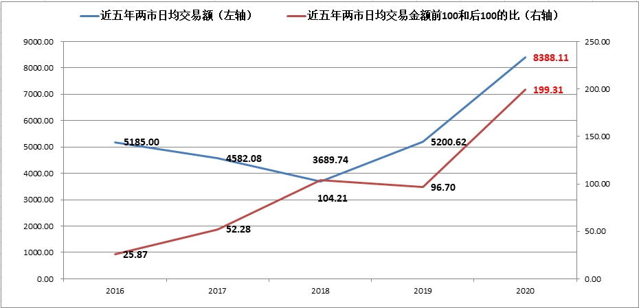 图二:近五年两市日均成交金额、两市日均成交金额前100/后100比值,数据来源wind