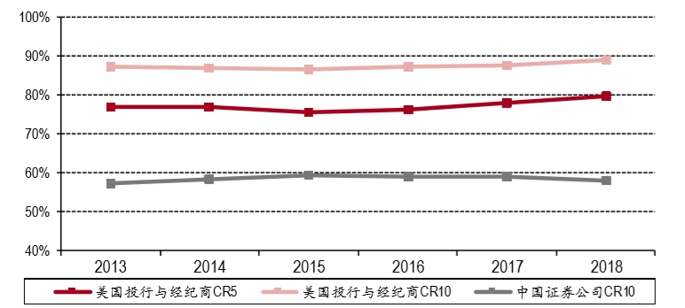 图四:2013-2018美国投行与经纪商营业收入集中度 vs 中国券商集中度