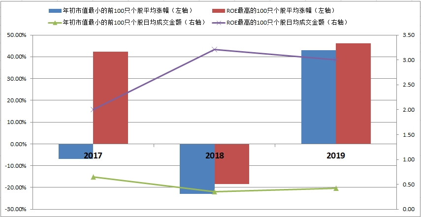 2、微型市值股票流动性下降,整体已步入熊市,核心资产则早已步入牛市,从近三年(2017-2019)的市场表现来看,小市值个股的市场表现无论从平均涨跌幅还是成交金额都已不如核心资产(净资产收益率ROE排名居前的)上市公司。