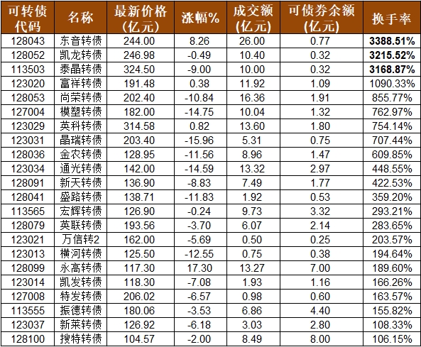 举例来说,目前可转债是采用T+0的交易制度且不设涨跌幅限制,4月10日(周五)有22只可转债的换手超过一倍,换手最多的则接近惊人的34倍,同时有7只可转债的跌幅超过10%,占比接近1/3。