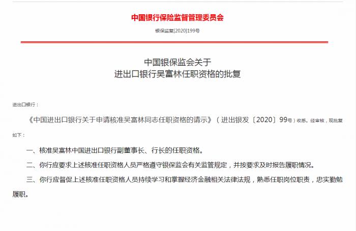 4月13日,银保监会公开了《关于进出口银行吴富林任职资格的批复》,核准吴富林中国进出口银行副董事长、行长的任职资格。