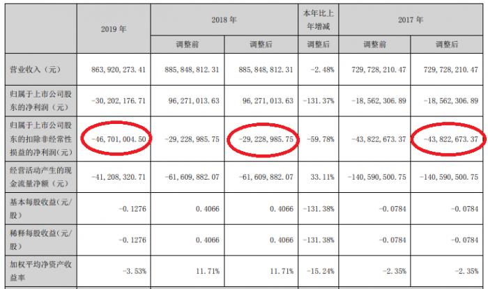 4月14日晚,西安旅游披露了2019年年报。报告期内,公司实现营业收入8.64亿元,同比下降2.48%;实现“归属于上市公司股东的净利润”-3020.22万元,同比下降131.37%;实现“归属于上市公司股东的扣除非经常性损益的净利润”-4670.10亿元,同比下降59.78%。“经营活动产生的现金流量净额”也是负数,为-4120.83万元。