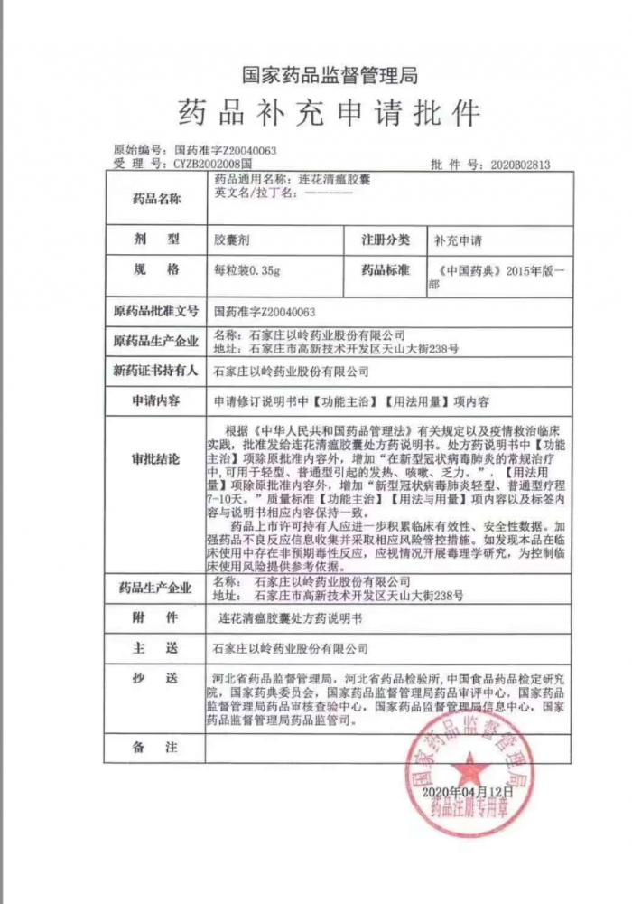 以岭药业公告中也展示了审批结论: