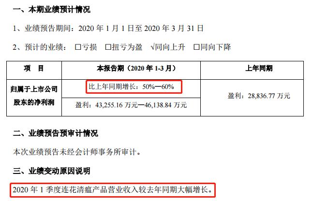 3月30日以岭药业发布第一季度业绩预告,公告显示,预计2020年一季度净利润为4.3亿元~4.6亿元,比上年同期增长50%~60%。这是自上市以来,以岭药业单季度盈利最多的一次。在业绩预告中,以岭药业解释称,连花清瘟产品营业收入较去年同期大幅增长。