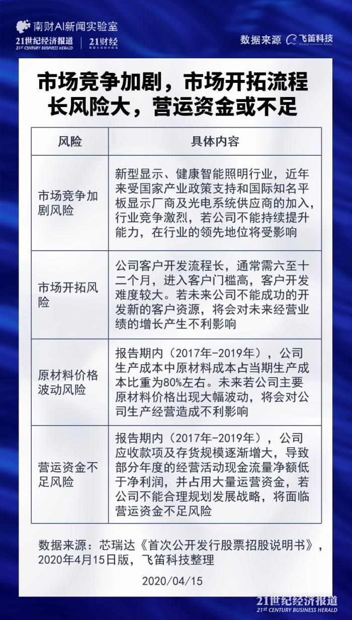 在4月15日芯瑞达发布的最新版招股书中,公司自行披露了21个风险,其中有4大风险能够较为直接地影响公司的经营状况,分别为市场竞争加剧风险、市场开拓风险、原材料价格波动风险、经营活动现金流量净额低于净利润导致的营运资金不足风险。